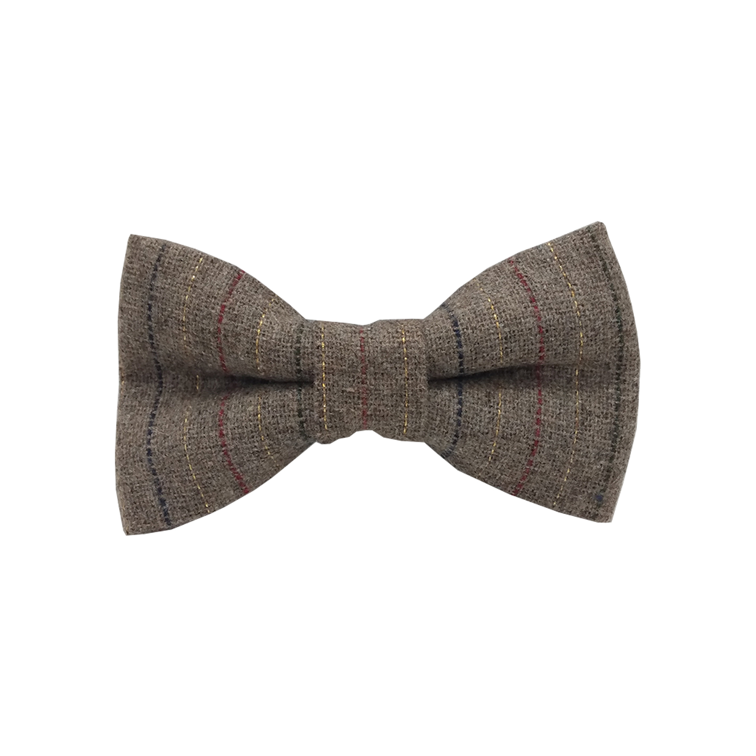 Tan coloured wool blend fabric with subtle navy, red, and gold stripes – gold thread has a shimmer effect